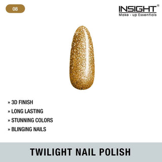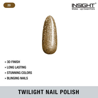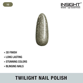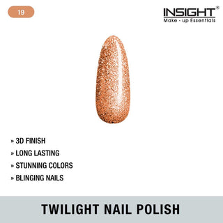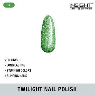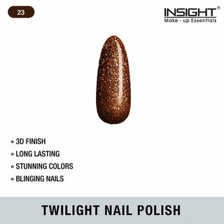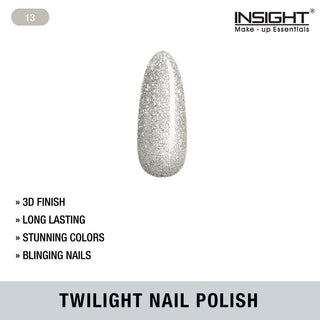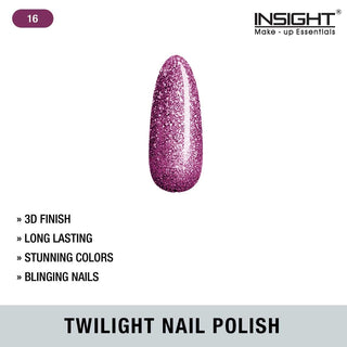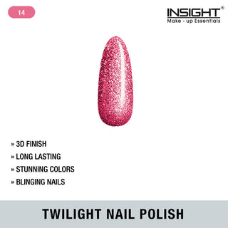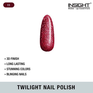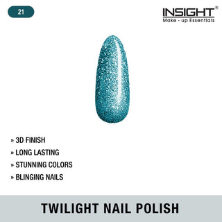Insight twilight nail polish is full of glitter and sparkle, it is 3d finish and blinding on nails. available in 24 colours you can use it alone or mix & match with any colours as per the occasion such as parties or dating.
