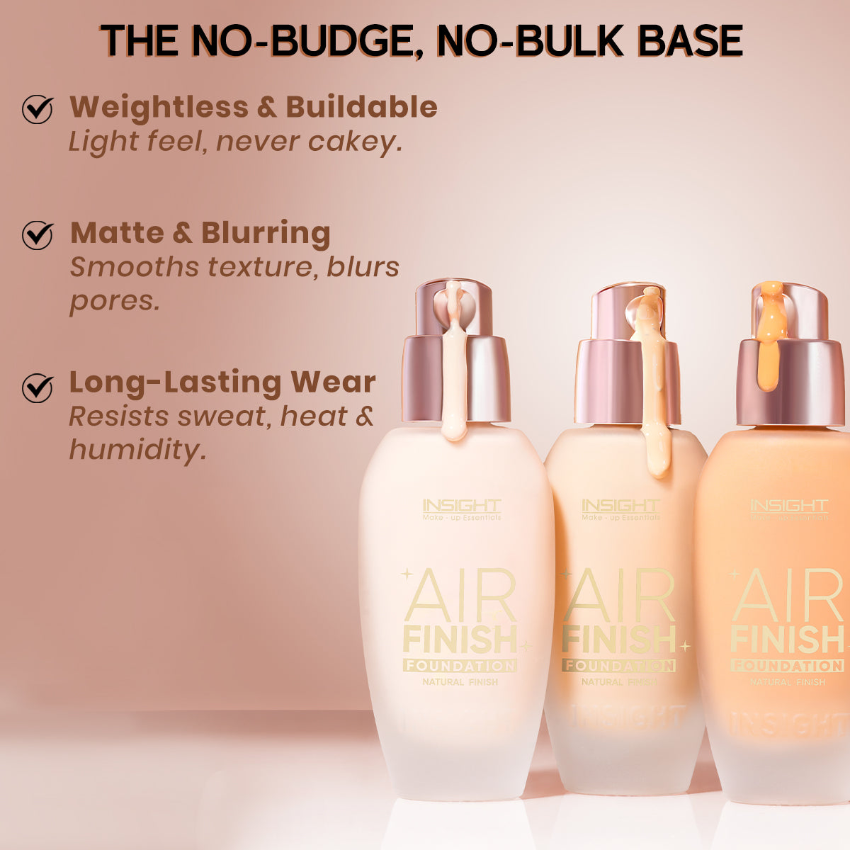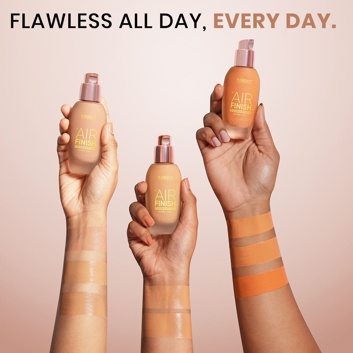 Achieve your perfect skin effortlessly with Insight’s Air Finish Foundation. Expertly crafted for a flawless airbrushed finish, the lightweight formula blends seamlessly into your skin, offering a natural matte look without feeling heavy or cakey. Its medium to buildable coverage ensures imperfections are covered, creating a refined and polished look. Designed for every moment of life, from morning meetings to late-night plans, it gives skin a smooth, flawless appearance while feeling as though you're wearing nothing at all. Feel comfortable, confident and camera-ready every moment of the day.