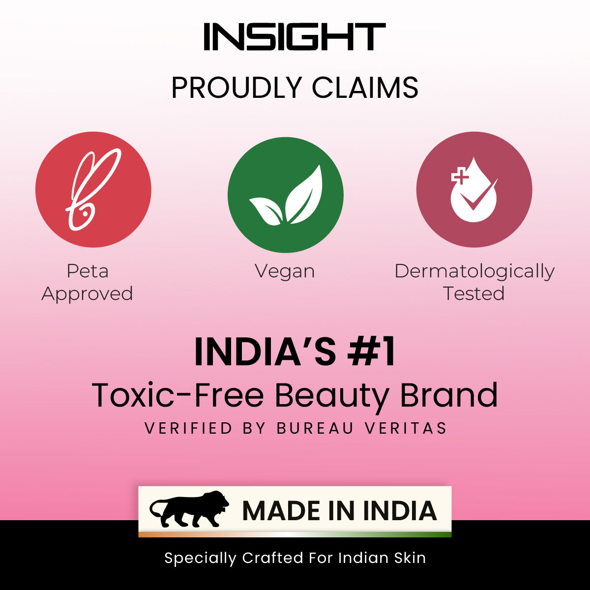 Insight cosmetics products are certified safe by bureau veritas as safe cert, dermatologically and Ophthalmology tested, VEGAN, PETA, FDA