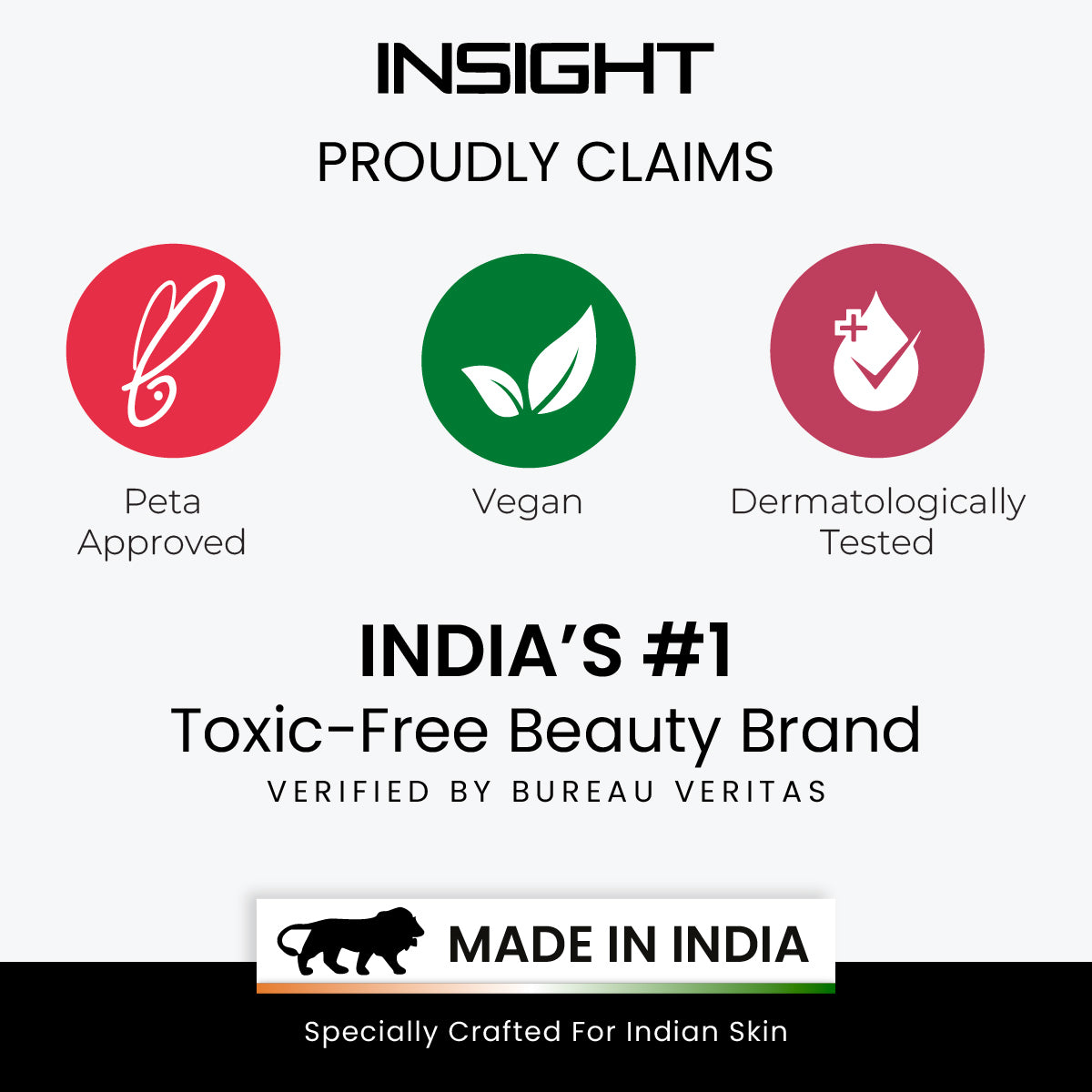 Insight cosmetics products are certified safe by bureau veritas as safe cert, dermatologically and Ophthalmology tested, VEGAN, PETA, FDA