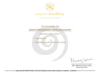 Insight cosmetics products are certified safe by bureau veritas as safe cert, dermatologically and Ophthalmology tested, VEGAN, PETA, FDA