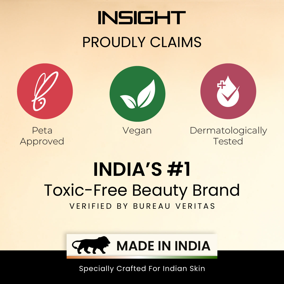 Insight cosmetics products are certified safe by bureau veritas as safe cert, dermatologically and Ophthalmology tested, VEGAN, PETA, FDA
